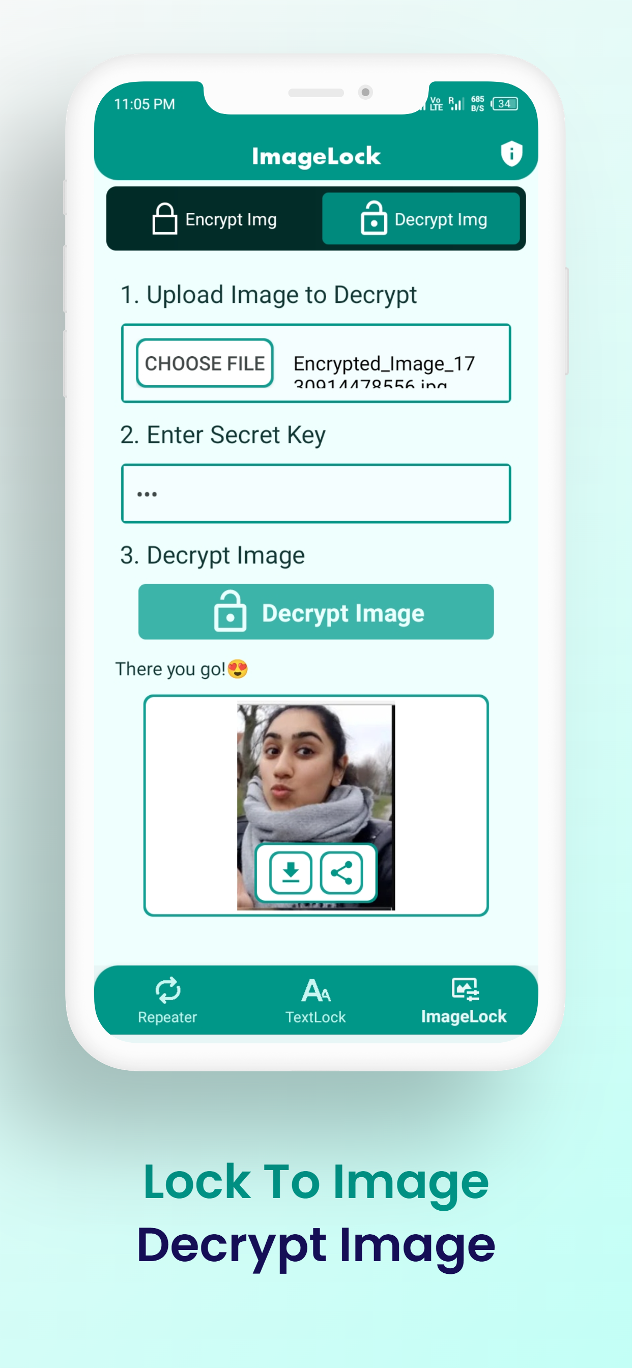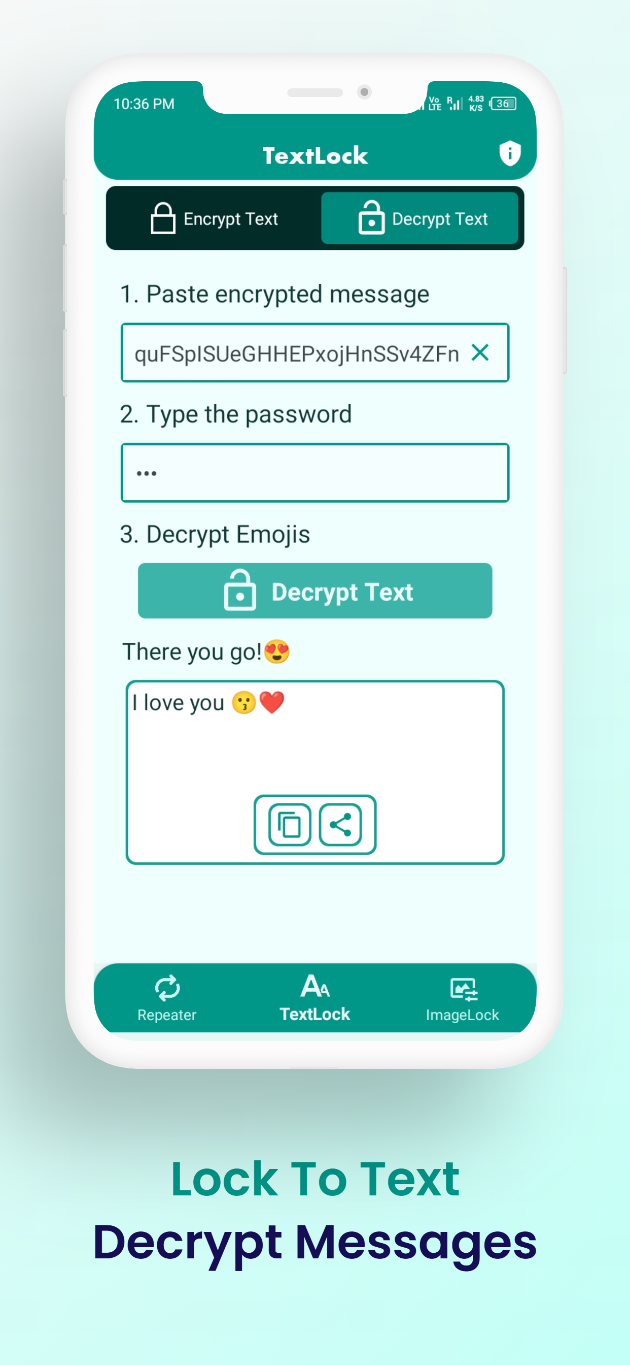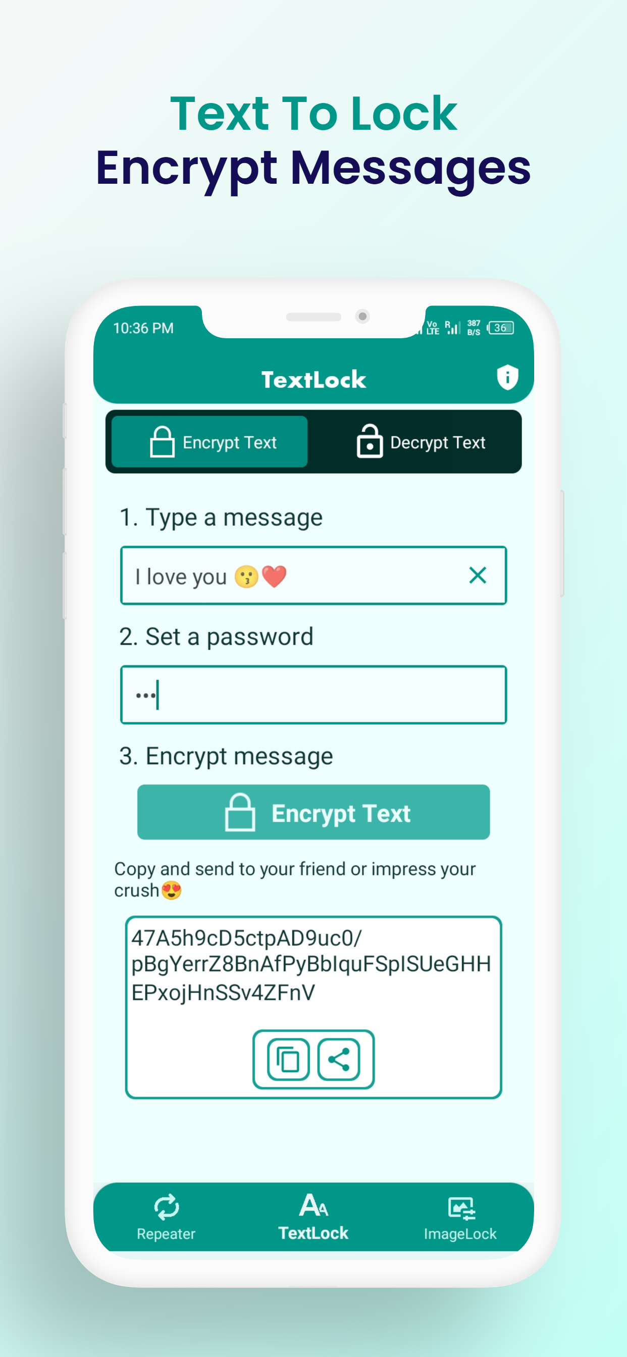 - Tap the Encrypt button, and your message/image will be converted into an encrypted format (unreadable to anyone without the password). ππ